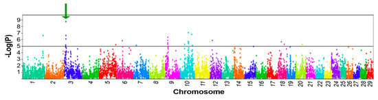 Genome-wide association analysis of basal CD18 leukocyte counts. Omnibus p-values for 15-SNP haplotype association were determined using PLINK. Green arrow points to the most probable association. Black horizontal line denotes the threshold value of significance considering Bonferroni correction for multiple comparisons.