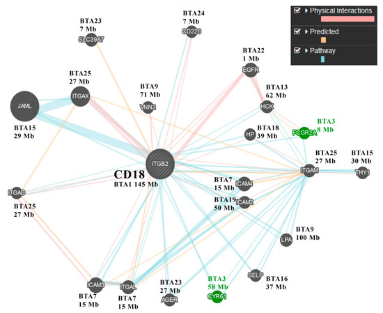 Gene network of the ITGB2 (CD18) gene. Connections between nodes were based on protein–protein interaction data, predicted functional relationships between genes, and gene-pathway data produced by the GeneMANIA system using ITGB2 as the input gene and the Homo sapiens database. On the output of this prediction server, next to the gene nodes, the orthologous bovine autosome numbers and positions were annotated. The nodes of genes with positions coinciding with BTA3 are highlighted in green.