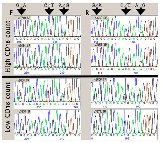 Sequence chromatograms of polymorphic stretch in CD32 third exon of high or low milk CD18-expressing heifers. Tail hairs of high (top) and low (bottom) CD18 leukocyte-count heifers were collected and the extracted DNA was used for simultaneous PCR amplification of the third exons encoding CD32. Forward (F) and reverse (R) orientation chromatograms show three variations (indicated by arrows) in which the ratio of nucleotide heights provides information on the number of paralogs encoding different antigen configurations. In these positions, G-C-A and G-T-G represent the reference sequences of FCGR paralogs 2B and 2A, transcript IDs: NM_174539 and NM_001109806, respectively.