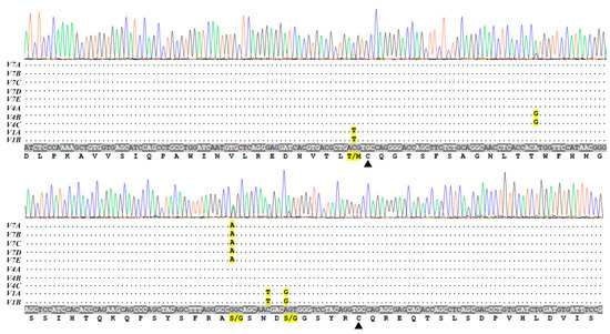 Sequence chromatograms of CD32 third exon of a representative Holstein sire compared to an allele model based on DNA-Seq. DNA extracted from semen was used for simultaneous PCR amplification of the third exons encoding CD32. Chromatograms show five variations in which the ratio of nucleotide heights provided information on the number of encoding paralogs. Below the chromatogram, dots indicate similarity to the consensus sequence of 10 allele variants predicted by the assembled sequences and counts of this sire’s DNA-Seq reads. Putative amino acid translation is given below the consensus sequence, in which codons are annotated by alternating font and background color. Nucleotide and amino acid variations are highlighted in yellow. Arrowheads point to the two cysteines predicted to form the disulfide bond that stabilizes an extracellular structure of the immunoglobulin-like C-2 type.
