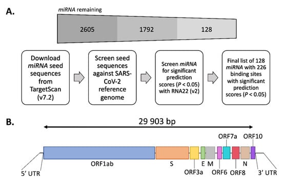 Computational identification of microRNA (miRNA) with predicted miRNA response elements (MREs) in the severe acute respiratory syndrome coronavirus 2 (SARS-CoV-2) reference genome. (A) Computational pipeline used to identify the 128 candidate miRNA with at least one predicted MRE. The remaining number of miRNA remaining after each step is shown above. (B) Schematic of the SARS-CoV-2 reference genome (NC_045512.2) with key features shown.