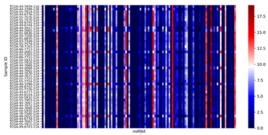 Analysis of miRNA expression (log2 transformed) from 46 normal lung tissue control samples in the TGCA-LUAD dataset.