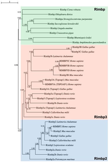In vertebrates, TSPO Associated Protein 1 or Tspoap1, also known as Rimbp1, has previously been referred to as Bzrap due to its ability to interact with the peripheral benzodiazepine receptor of mitochondria []. Within the tunicate-specific database ANISEED [], reciprocal BLASTs revealed that the previously named Bzrap gene of C. robusta was closely related to various Rimbp2/3 family genes, for this reason, it has been called Rimbp Domain analysis confirmed that Ciona Rimbp protein shared the domain organization based on FN3 repeats and Src homology 3 (SH3) (Figure S1). To decipher Rimbp evolutionary history, we improved a previous analysis of Rimbp genes [] by including in our survey proteins from Porifera up to Chordates. More specifically, we analyzed sequences belonging to the following species: the sponge Amphimedon queenslandica, the ctenophore Mnemiopsis leidyi, the cnidarian Nematostella vectensis, the brachiopod Lingula anatina, the arthropods Drosophila melanogaster (insect), Anopheles gambiae (insect) and Daphnia magna (crustacean), the nematode Caenorhabditis elegans, the mollusks Crassostrea gigas (bivalve) and Octopus bimaculoides (cephalopod), the ambulacrarians Saccoglossus kowalevskii (hemichordate) and Strongylocentrotus purpuratus (echinoderm), the tunicates Oikopleura dioica (larvacean) and Ciona robusta, Phallusia mammillata, Halocynthia aurantium (ascidians), the vertebrates Petromyzon marinus (lamprey), Callorhinchus milii (cartilaginous fish), Latimeria chalumnae (coelacanth), Lepisosteus oculatus (non-teleost actinopterygian), Danio rerio (teleost), Xenopus tropicalis (amphibian), Podarcis muralis (reptile), Gallus gallus (avian), Mus musculus and Homo sapiens (mammals) (Table S1). Sequences characterized by a high degree of evolutionary divergence have been excluded from the phylogenetic study (Table S2). We did not find any Rimbp ortholog in unicellular eukaryotes and plants. This evolutionary survey based on 48 Rimbp proteins strongly supports the existence of a single Rimbp in tunicates and other invertebrates (green box) that resulted in being orthologous to both vertebrate Rimbp2 (blue box) and Rimbp3 (orange box) (Figure 1). Among the surveyed invertebrate species, sea urchin S. purpuratus was the only one showing duplication (here, referred to as Rimbpa and Rimbpb), with Rimbpb excluded from the tree given its evolutionary divergence (Table S2). The vertebrate protein classes named Rimbp2 and Rimbp3 (Figure 1 and Table S2) encompass various proteins that in genome databases (Ensembl, NCBI) are named in a different manner (see Table S3 for old and new names). Our phylogenetic reconstruction clearly demonstrated that the human protein known as Tspoap1 belongs to Rimbp3 cluster (Figure 1), thus we renamed it as RIMBP3A. Moreover, the human gene known as RIMBP3 has been renamed RIMBP3D (Figure 1 and Table S3). This analysis allowed the identification of several Rimbp2 and Rimbp3 duplicates in distantly related vertebrates such as zebrafish, coelacanth, and human (Figure 1 and Table S2). The existence of Rimbp duplicates could have resulted from isolated cases of gene duplication or from one of the two whole-genome duplications that occurred at the stem of vertebrates [,]. To better understand Rimbp evolution in chordates, we surveyed the conservation of the Rimbp genome environment (Figure S2), allowing us also to define the orthology of vertebrate Rimbps better. In vertebrates, Rimbp2 genes belong to a region comprising a conserved linkage formed by Ran and Stx genes [], which is not syntenic with Rimbp3 genomic locus (Figure S2). These findings suggest a local duplication at the root of vertebrates involving the ancestor of these two genes. Interestingly, ascidian Rimbp (C. robusta, Halocynthia aurantium) and vertebrate Rimbp3 genes preserved chromosomal vicinity with the mitochondrial E3 ligase Mul1 []. Furthermore, in the tunicates Ciona robusta and Phallusia mammillata, Rimbp forms a triplet (Figure S2) with Rab3Gap1, which in vertebrates is implicated in Warburg and Martsolf syndromes and, like Rimbp proteins, is an effector of Rab3 proteins [,,], and Chmp2 []. In synthesis, our evolutionary data strongly support an orthology of ascidian Rimbp with the invertebrate Rimbp and with vertebrate Rimbp2 and Rimbp3 genes, which are affected by diverse duplication events.