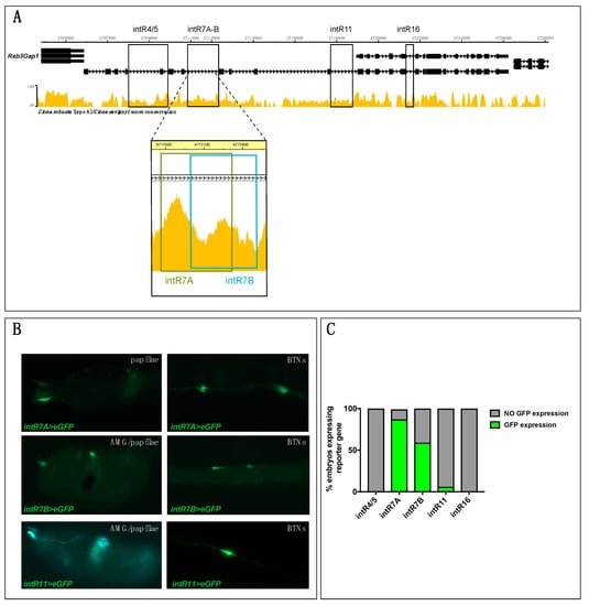 Intronic Cis-regulatory elements of Rimbp of Ciona robusta. (A) The genomic region comprising Rimbp and Rab3Gap1 with an automatic mVISTA plot between C. robusta and C. savignyi (ANISEED); rectangles indicate the intronic regions selected for cloning in eGFP vector (intR4/5, intR7, intR11, intR16). Dashed lines show a higher magnification of the two distinct regions selected for the intR7 (intR7A and intR7B). (B) Expression of larvae electroporated with 70 micrograms of intR7A>eGFP, intR7B>eGFP, and intR11>eGFP in different PNS territories of larva (st. 26) possibly including BTNs, papillae neurons, and AMGNs. (C) Percentages of larvae electroporated along with intR4/5, intR7, and intR11, intR16 expressing with GFP in at least one type of cells of the nervous system. Each experiment was performed four times and at least 200 embryos were scored per each experiment.