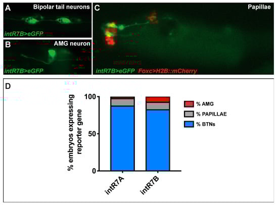 As for the endogenous signal, we observed a strong expression in BTNs, [,] (Figure 4A,D). These neurons are situated on either side of the neural tube and extend their axons along the entire length of the tail. Electroporated larvae also showed strong expression in ascending motor ganglion or AMG neurons (AMGNs), which are peripheral interneurons located dorsally to the core motor ganglion [] (Figure 4B). The intR7 guided expression, also in neurons of the papillae, which are glutamatergic neurons that project their axons along the rostral PNS and into the sensory vesicle []. Papilla neuron expression of intR7 was confirmed by double electroporation along with FoxC>H2BmCherry, which marks the papilla territory [] (Figure 4C). Hence, we found that both intR7A and intR7B drive expression in the same nervous territories with the signal in BTN cells represented the vast majority, with 80% of positive larvae (Figure 4D).