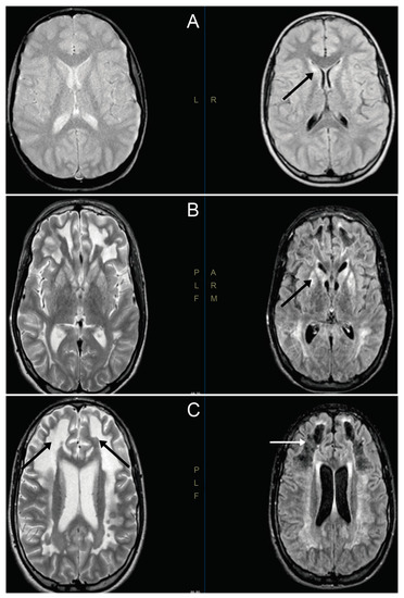 Magnetic resonance images of V-4′s brain. (A) Cranial magnetic resonance images (MRIs) at 9 years old. Hyperintense lesions are observed symmetrically, affecting both heads of the caudate and putamen. The putamen-focused spectroscopic study showed a peak of high lactate, with a decrease in N-acetylaspartate and creatine (black arrow). (B) Cranial MRI at 15 years old, showing an increase in lesions in the basal ganglia (black arrow). (C) Cranial MRI at 15 years old, showing great involvement of white matter demyelination in both hemispheres (black arrows) and in the area of the frontal necrotic lesions (white arrow).