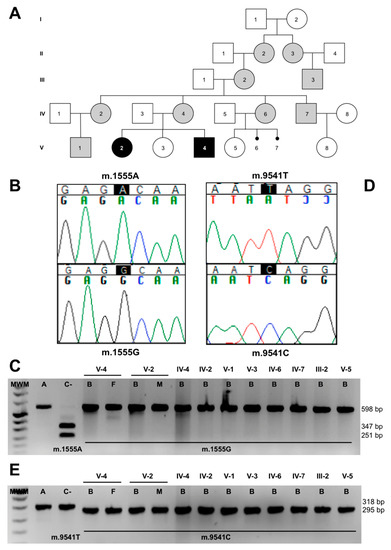 m.1555A>G and m.9541T>C mutations. (A) Pedigree. Gray and black colors are code for hearing loss and Leigh syndrome patients, respectively. (B) Electropherogram of a segment of the patient’s mtDNA sequence, showing the m.1555A>G transition. (C) Restriction fragment length polymorphism (RFLP) gel, showing the mutation load in the pedigree members. (D) Electropherogram of a segment of the patient’s mtDNA sequence, showing the m.9541T>C transition. (E) RFLP gel, showing the mutation load in the pedigree members. A = amplicon, C- = negative control, B = blood, F = fibroblasts and M = muscle.
