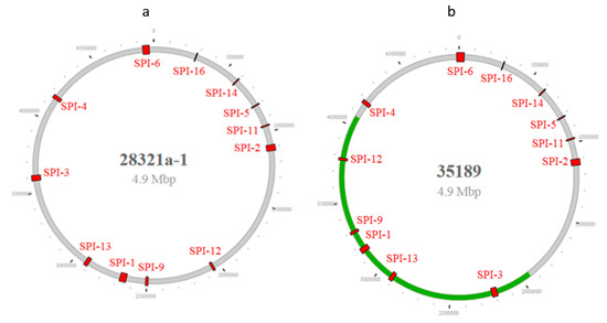 (a). Presence and distribution of SPIs in S. Typhimurium (28321a) and (b). S. Reading (35189) genomes. Green line indicated that a DNA segment linked with the SPI-3/SPI-13/SPI-1/SPI9/SPI-12 sequences had a changed orientation compared with other serotypes.