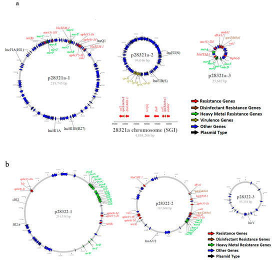 (a) Genomic structure of MDR plasmids and virulence plasmids from S. Typhimurium (O5-) (28321a) and (b). S. Heidelberg (28322) isolated from diseased swine. The color codes are given on the bottom right of each figure.