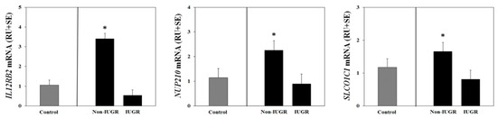 - Hahn-Zoric, M.; Hagberg, H.; Kjellmer, I.; Ellis, J.; Wennergren, M.; Hanson, L.A. Aberrations in placental cytokine mRNA related to intrauterine growth retardation. Pediatr. Res. 2002, 51, 201–206. [Google Scholar] [CrossRef]