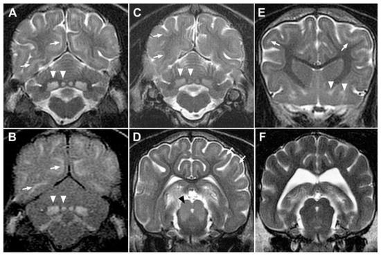 Two affected dogs (dogs 1 and 2) and four other related but unaffected dogs had an MRI of the brain. All four unaffected dogs had unremarkable MR images. Both affected dogs exhibited prominent sulci (Figure 2A,C–E) compared to normal dogs (Figure 2F), consistent with diffuse cortical atrophy. Bilateral, symmetrical, T2 and FLAIR hyperintensity was present in the diencephalon, deep cerebellar nuclei (Figure 2A–C), midbrain (Figure 2D), and multiple basal nuclei (Figure 2E). Multifocal, symmetrical T2 and FLAIR hyperintensity was also present in the deep cortical laminae of the grey matter throughout the cerebral cortex (Figure 2A–F).