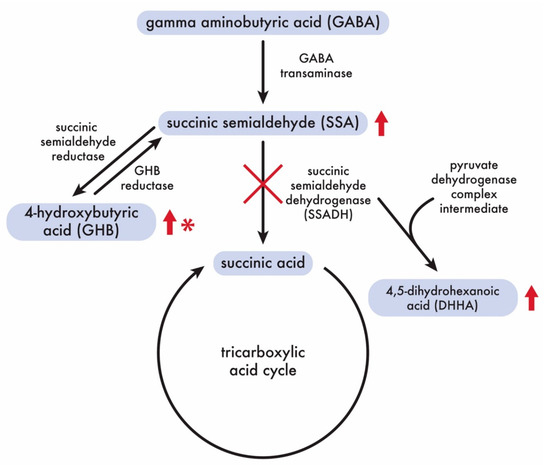 The SSADH protein is expressed in the mammalian brain, as well as liver, pituitary, heart, ovary and kidney [35]. In people, the ALDH5A1 gene is located on chromosome 6p22, and is 10 exons long extending over 38 kb [36]. Succinic semialdehyde dehydrogenase (NAD+) is an enzyme which is member of the aldehyde dehydrogenase family of proteins. In people with SSADH enzyme deficiency, SSA is not catabolized to succinic acid, and thus excess levels of SSA build up in tissues and fluids (Figure 7). Excess succinic semialdehyde is converted to 4-hydroxybutyric acid (GHB) by succinic semialdehyde reductase. Excess SSA may also interact with an intermediate in the pyruvate dehydrogenase complex to form 4,5-dihydroxyhexanoic acid (DHHA). People with a deficiency of SSADH have elevations of SSA, DHHA, and GHB in body fluids [35]. The activity of SSADH is reduced in people, and thus levels of SSA rise, with associated high levels of GHB and DHHA (Figure 7) [37]. The hallmark of SSADH deficiency in people is persistent and elevated levels of the GHB in urine, plasma and CSF [37]. The diagnosis is confirmed by molecular genetics by sequencing the ALDH5A1 gene for pathogenic variants. There is no effective therapy [37].