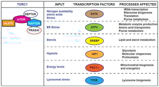 Transcription factors downstream of TORC1, input linked to their action and cellular processes affected.