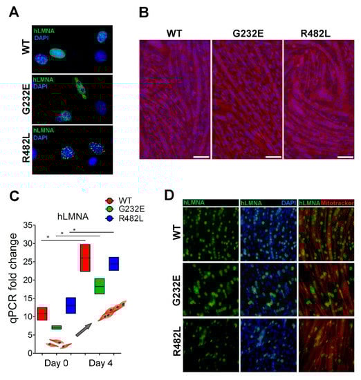 Validation of experimental model: (A) Verification of transgene hLMNA expression in C2C12 mouse myoblasts: the cells were stained with anti lamin A antibody recognizing only human lamin A. LMNA G232E/R482L shows aggregates and nuclear blebbing in some of the transduced cells as a result of the mutation; (B) stimulation of myogenic differentiation resulted in myotubes formation in all transgene lines (scale bar = 200 μm); (C) hLMNA mRNA expression tested in transgene C2C12 myoblasts and in differentiated myotubes (n = 3; * p < 0.05); (D) nuclei in myotubes demonstrate hLMNA-positive staining (scale bar = 100 μm).