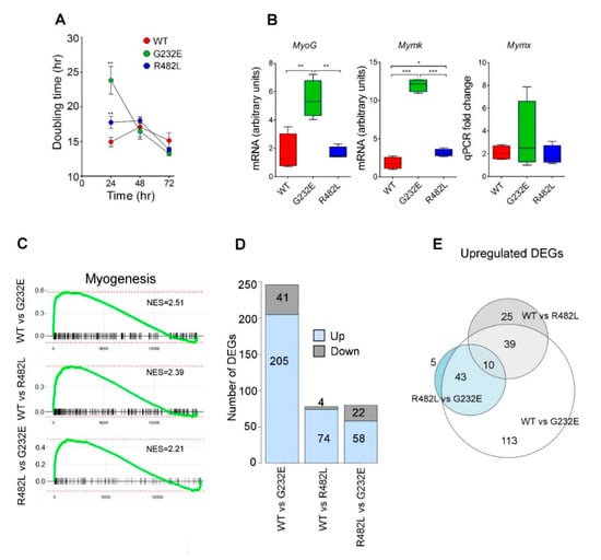 G232E/R482L-LMNA—induced alterations in functional properties of C2C12 myoblasts: (A) Estimation of the cell population doubling time for C2C12 cell lines, transduced with WT-LMNA, G232E-LMNA, and R482L-LMNA at three time points until 72 h. Values are mean ± SEM (n = 4). ** p < 0.01; (B) mRNA expression of the genes that regulate the early steps of myogenic differentiation in C2C12 myoblasts. (n = 4; * p < 0.05; ** p < 0.01; *** p < 0.001); (C) GSEA enrichment plots of the hallmark myogenesis pathway over ranked genes between all possible pairs of C2C12 myoblasts: WT versus G232E-LMNA, WT versus R482L-LMNA, and R482L-LMNA versus G232E-LMNA. (p-adjusted < 0.001, normalized enrichment scores (NES) are shown); (D) number of up- and downregulated differentially expressed genes (DEGs) found in all three pairs (log2 fold change > 1, p-adj < 0.01); (E) Venn diagrams of upregulated DEGs.