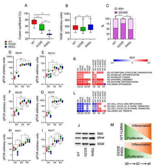 Myogenesis in transgene cultures. (A) Fusion coefficient calculated as a percent of nuclei incorporated in differentiated myotube in independent photographs; n = 8; *** p < 0.001, t-test; (B) width of myotubes, measured in arbitrary units in 5–6 independent photographs; the number of myotubes on each photo was 10–20; *** p < 0.001, t-test; floating bars are shown with mean, minimum and maximum values; (C) diagram illustrate the fractions of “massive” and “overage” myotubes in cultures; * p < 0.05; (D–F) The mRNA expression dynamics of genes that regulate myoblast fusion (Mymk, Mymx) and of myogenic regulatory factor Myog (n = 4; mean + SEM; * p < 0.05; ** p < 0.01; *** p < 0.001; Mann–Whitney test); (G–I) the mRNA expression dynamics of fiber-specific genes: fast glycolitic fiber Myh1 isoform; oxidative slow fiber Myh7 isoform; embryonic myosin isoform Myh3; (n = 4, mean + SEM, * p < 0.05; ** p < 0.01; Mann–Whitney test). (J) Western blotting analysis for total myosin (slow (antibody interact with slow Myh7) and fast (antibody interact with fast Myh1/Myh2) proteins in cultures stimulated with myogenic differentiation media at day 4 after induction; (K,L) Results of gene set enrichment analysis visualized as a heat map of normalized enrichment score (NES) that display significant up/downregulated myogenic pathways (K) and cell cycle dynamics (L); (M) summarized diagram that illustrates the considerable dysregulation in coordination of cell cycle dynamics and myogenic differentiation in G232E/R482L-LMNA myoblasts.
