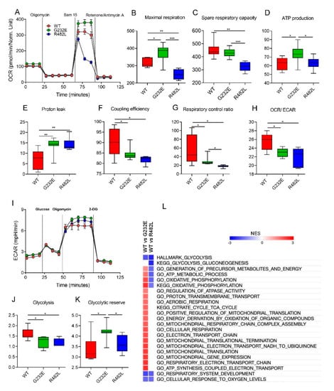 Metabolic profiles of C2C12 myotubes bearing lentiviral WT/G232E/R482L-LMNA. (A–H): Determination of mitochondrial bioenergetic parameters from OCR profile. (A) OCR traces for myotubes expressing WT/G232E/R482L-LMNA; (B–G) Indices of mitochondrial respiratory function: (B) maximal respiratory capacity; (C) spare respiratory capacity; (D) ATP-linked respiration; (E) proton leak respiration; (F) coupling efficiency; (G) cell respiratory control ratio; (H) OCR/ECAR ratio at maximal respiration. OCR was measured at the same time as ECAR. (I–L): Determination of glycolytic function. (I) Kinetic profiles of ECAR in myotubes expressing WT/G232E-LMNA/R482L-LMNA. ECAR was measured in real time, as indicated. Indices of glycolytic pathway activation calculated from ECAR profile: (J) Maximal glycolysis and (K) glycolytic reserve capacity. All data are calculated from 6–8 Seahorse microplate wells and are normalized to total protein in each well. * p < 0.05; ** p < 0.01 *** p < 0.001; two-tailed Student’s t-test. All floating bars are shown with mean, minimum and maximum values. (L) Heat map of NES values after GSEA analysis represents metabolic pathways found up- or down-regulated in G232E/R482L myotubes compare with WT-LMNA; FDR = 0.05.