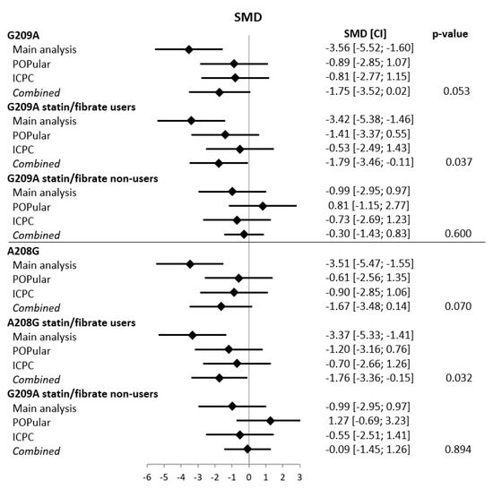 Baseline characteristics of the POPular validation cohort (n = 729) and the ICPC validation cohort (n = 882) are shown in Supplemental Table S2. In general, clinical characteristics and gene frequencies were comparable between the three cohorts. The lower platelet reactivity found in the main analysis for the PPAR-α G209A AA and the PPAR-α A208G GG genotype was also found in the POPular validation cohort, but the effect was less pronounced and not statistically significant (G209A AA: −10.5 PRU [95%CI −33.8, 12.7], p = 0.35; A208G GG: −7.0 [95%CI −29.5, 15.6], p = 0.51) (Supplemental Figure S3 and Table S3). Still, the odds ratio for HPR > 208 PRU was comparable to the results found in the main analysis (G209A AA: OR 0.67 [95%CI 0.36; 1.23], p = 0.22; A208G GG: OR 0.75 [95%CI 0.41, 1.34], p = 0.37) (Supplemental Table S4). When stratified to statin/fibrate users versus non-users there was a lower platelet reactivity in statin/fibrate users (G209A AA: −18.1 PRU [95%CI −44.6, 8.5], p = 0.18; A208G GG: −14.5 [95%CI −39.8, 10.7], p = 0.18), but a higher platelet reactivity in the statin/fibrate non-users (G209A AA: +13.6 [95%CI −33.7, 60.9], p = 0.57; A208G GG: +24.6 [95%CI −25.0, 74.2], p = 0.33) (Supplemental Figure S3 and Table S3). In the ICPC validation cohort both PPAR-α SNPs were also associated with numerically lower ADP-induced platelet reactivity, but without statistically significant differences (Supplemental Table S5). This held true for both the whole group and for the statin/fibrate user or non-user subgroups. When all three databases where combined using a random effects meta-analysis model, platelet reactivity was significantly lower for both the PPAR-α G209A and A208G homozygous minor allele carriers in the subgroup of statin users (p = 0.04 for G209A and p = 0.03 for A208G) (Figure 2), although the effect is driven by the results of the main analysis. There was no significant effect found in the combined analysis for the subgroup of statin/fibrate non-users.