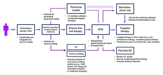 Framework outlining strategies to facilitate implementation of PDAC precision oncology in clinical care. Dotted lines highlight the value of generating preclinical models in parallel, if such platforms are available. Double-headed arrow depicts the potential use of preclinical models to (1) inform precision oncology trial designs and (2) gain mechanistic understanding of treatment responses and acquired treatment resistance observed in biomarker-driven clinical trials. GC, genetic counselling; GT, germline testing; MTB, molecular tumor board; AI, artificial intelligence.
