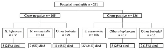 Bacterial etiology was confirmed from all 241 BM cases. Of these, 136 (56%) were caused by Gram-positive bacteria and 105 (44%) by Gram-negative bacteria. The bacterial distribution is presented in Figure 1. The three most common pathogens identified were S. pneumoniae (n = 108, 44.8%), N. meningitidis (n = 43, 17.8%), and H. influenzae (n = 38, 15.8%). The overall case fatality rate was 26% (n = 63). The highest fatality rate was 34% (n = 37) in pneumococcal meningitis, whereas the lowest fatality rate was 5% (n = 8) in meningococcal meningitis.