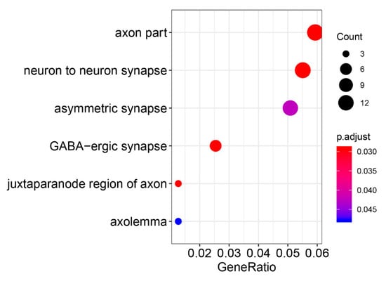 Mapping the significant SNPs to the gene domain of the hg38 reference genome in a 10 kb interval [], the GO enrichment results showed that six biological functional regions were significantly enriched (Bonferroni-corrected p-value < 8 × 10−3, Supplementary Table S1). Four significantly enriched biologically functional regions have been reported to be associated with PD, including the axon [], neuron-to-neuron synapse [], asymmetric synapse [] and gamma aminobutyric acid (GABA)-ergic synapse [] (Figure 2). Therefore, these results indicate that the meta-analysis of GWAS data reflects the pathological features of PD.