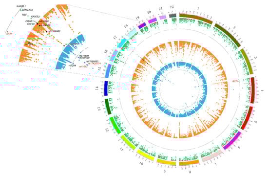 - Zhu, Z.; Zhang, F.; Hu, H.; Bakshi, A.; Robinson, M.R.; Powell, J.E.; Montgomery, G.W.; Goddard, M.E.; Wray, N.R.; Visscher, P.M.; et al. Integration of summary data from GWAS and eQTL studies predicts complex trait gene targets. Nat. Genet. 2016, 48, 481–487. [Google Scholar] [CrossRef]