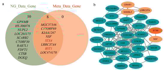 Independent dataset validation of six identified risk genes. (a) Significant genetic intersection of independent GWAS data and meta-analysis GWAS data tested. The most significant genes of the latest GWAS data and the significant genes after SMR and HEIDI include STX4 and BST1, respectively. (b) Protein–protein interaction network of significant genes in the PD-Gene identified by SMR and HEIDI. STX4 interacts with known PD risk genes.