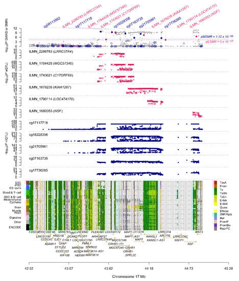 Summary of SMR correlation analysis across GWAS, eQTL and mQTL on Chr17. The figure above shows the −log10 (p-values) of the SNPs from meta-analytic GWAS data. The middle two graphs are −log10 (p-values) of SNPs in eQTL and mQTL, respectively. The lower diagram shows chromatin status annotation information.
