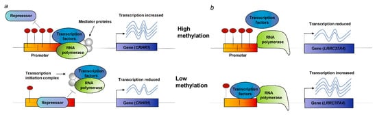 Potential regulatory mechanisms. (a) When the DNAm site in the promoter is high, the binding of the inhibitor and the promoter is prevented; the transcription factor normally binds to the promoter, and the expression of CRHR1 increases; when the DNAm site is low, the inhibitor binds to the promoter, and CRHR1 transcription is suppressed. (b) When DNAm in the promoter is high, the binding of transcription factors is disrupted, thereby suppressing the expression of LRRC37A4. When DNAm is low, transcription factors usually bind to the promoter, and the expression level of LRRC37A4 increases.