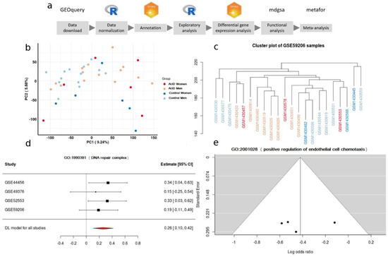 Figure 1. (a) Data-analysis workflow. (b) Principal Component Analysis plot in the GSE44456 study. (c) Clustering. (d) A forest plot of the GO:1900391, showing the LOR (log odds ratio) of each study and the global result. (e) Funnel plot of the GO:2001028; dots in the white area indicates the absence of bias and heterogeneity.