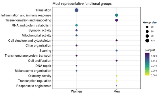 Figure 5. Differential Functional Profiling by Sex. The dot plot shows the functional groups with the greatest differential activity between the sexes. Each dot represents a biological function. Size indicates the number of genes involved in that function and color associated with the level of significance.