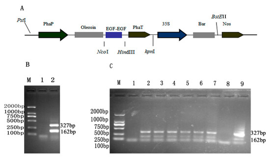 Construction and detection of pOTB–hEGF–hEGF. (A) Schematic diagram of T-DNA region from pOTB–hEGF–hEGF; (B) PCR detection of recombinant plasmid; (C) T3 transgenic Arabidopsis seeds were determined by RT–PCR; (M) DNA2000 marker; 1—negative control (wild type); 2–7—T3 transgenic seeds; 8—negative control (water); 9—positive control (pOTB–hEGF–hEGF plasmid).