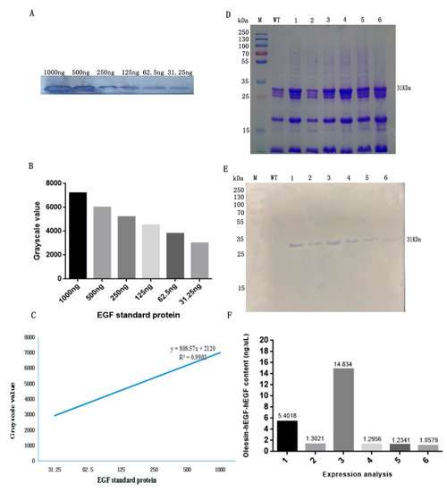 Protein expression from T3 transgenic Arabidopsis. (A) western blot; (B) grayscale values and (C) the standard curve of the grayscale values from various concentrations of hEGF standard protein; (D) SDS-PAGE of the oil body; (E) western blot of fusion protein and (F) quantitation of fusion protein from T3 Arabidopsis seeds. M—protein marker; 1–6—oil body in T3 Arabidopsis; WT—oil bodies from WT Arabidopsis.