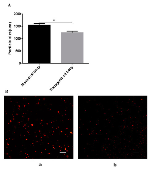 Measurement and observation of size and microstructure from transgenic oil body and normal oil body. (A) Particle size; (B) microstructure observation; (a) dyed normal oil bodies via Nile red; (b) dyed transgenic oil bodies via Nile red. The images were shown at 40 × 10 magnification (scale bars = 10 µm). ** p < 0.01 vs. normal group.