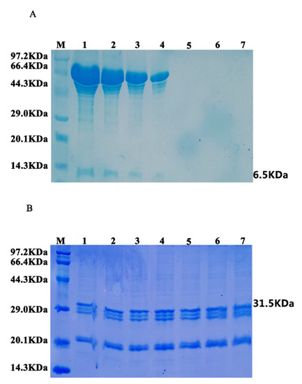 Analysis of hEGF protein and oleosin–hEGF–hEGF activation stability. (A) SDS-PAGE analysis of hEGF standard protein digested with protease at different times; (B) SDS-PAGE analysis of oleosin–hEGF–hEGF digested with protease at different times; (M) protein marker, 1–7—hydrolyzed protein of 0, 10, 15, 30, 45, 60, 90 min.