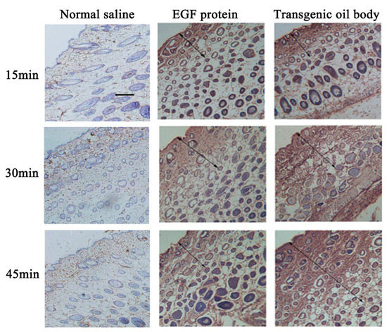The capacity of transdermal absorption was compared between transgenic and normal oil body. hEGF protein as position control was smeared on the mice’s backside for 15, 30 and 45 min. The results showed that the absorption capacity of oleosin–hEGF–hEGF expressed by oil bodies was better than hEGF protein because some unabsorbed hEGF protein remained on the skin in this group during the 45-min transdermal absorption test. It was verified through immunohistochemical staining as shown in Figure 5. Compared with the same hEGF protein, the transgenic oil body group showed more positive cells, and at each time point, the staining intensity of oleosin–hEGF–hEGF expressed by oil bodies was greater than that of hEGF protein and normal saline treatment group. Biologic replicate test data are given is Figure S1. More absorbed protein could be concentrated in the subepidermal tissue and hair follicles.