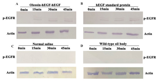 In order to find if oleosin–hEGF–hEGF could activate the EGFR receptor, we performed protein immunohybridization on skin total proteins at various time points in the transdermal absorption experiment. Figure 6 illustrates the results of p-EGFR receptor activation analysis. The recombinant protein oleosin–hEGF–hEGF (Figure 6A) and hEGF standard protein (6B) flaunted bands while normal saline (6C) and WT oil body (6D) were put as negative controls where bands are absent. With the transdermal absorption of oleosin–hEGF–hEGF and hEGF standard protein, the EGFR receptor began to activate at 0–15 min.