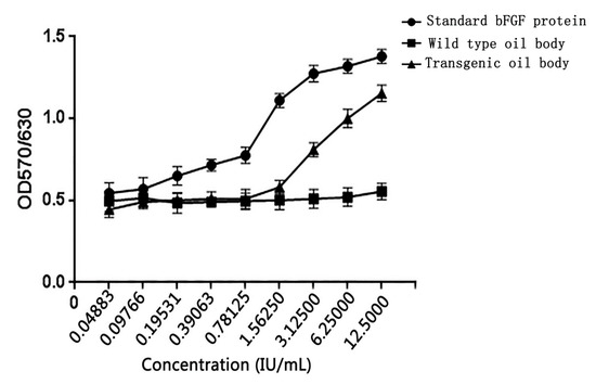 To assess the activity of transgenic oil bodies, we selected NIH/3T3 cell. The proliferation capacity of the transgenic oil body was detected in NIH/3T3 cell. As bFGF exhibits better activity to promote NIH/3T3 cells proliferation, the proliferation capacity was of oleosin–hEGF–hEGF and bFGF was compared [19]. The bFGF protein (12.5I U/mL) was diluted with 2-fold, which enhanced NIH/3T3 cells proliferation. The normal oil body displayed statistically insignificant proliferation capacity, however, the oleosin–hEGF–hEGF protein had a dose-dependent cell proliferative effect on the NIH/3T3 cells (Figure 7).
