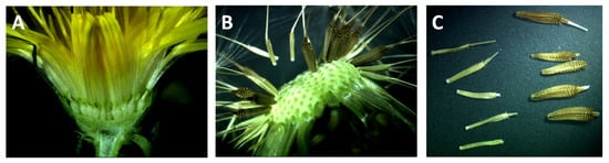 (A) A longitudinal section of a capitulum (inflorescence) of Taraxacum officinale, showing the florets attached to the receptacle. The inferior ovaries have a single ovule and produce a single-seeded fruit (achene), often referred to as “seed”. (B) An opened seed head of an apomict that produces both light and dark brown seeds (about ten days after flowering). Light brown seeds are empty ((C), left), while dark brown seeds ((C), right) generally germinate.