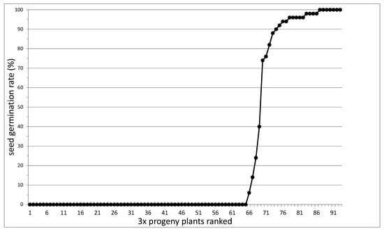 As one triploid F1 plant died before its reproductive system could be assessed, the remaining 94 3 × plants were used for further analysis. Apomictic seed setting was variable, as can be seen in the examples shown in Figure 3. As shown in Figure 4, 69 percent of the triploid F1 plants produced no germinating seeds (64/93; for one apomictic F1 plant (H69), seed setting was not quantified). By contrast, 24 percent of the triploid F1 plants produced more than 80% germinating seeds (22/93). The remaining six plants produced seeds with a germination rate between 6 and 78 percent, which may be due to incomplete penetration of apomixis factors. The two-locus model outlined in Figure 1 predicts 41 of the 94 triploid offspring plants to be apomictic, while the three-locus model predicts a significantly fewer 28 apomicts. A total of twenty-nine triploid apomicts were recovered, fitting the three-locus model well (χ2 = 0.05, degrees of freedom (d.f.) = 1; the p-value is 0.82, not significant at p < 0.05) and contradicting the two-locus model (χ2 = 6.23, d.f. = 1; the p-value is 0.01, significant at p < 0.05).