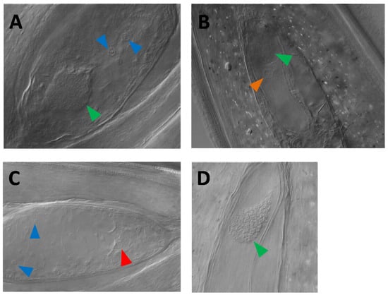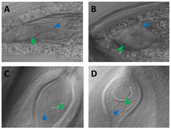Examples of parthenogenetic embryo-like structures in 2 × non-apomictic plants that carry the Par-marker. (A) and (B): plant H47; panels (C) and (D): plant H17. The green arrows point to the embryo-like structures; the blue arrows, to the endosperm nuclei/cells.