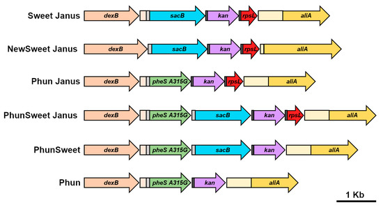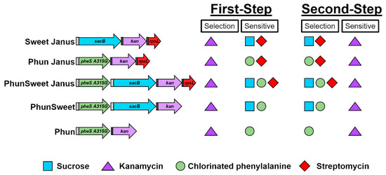- Li, Y.; Thompson, C.M.; Lipsitch, M. A modified Janus cassette (Sweet Janus) to improve allelic replacement efficiency by high-stringency negative selection in Streptococcus pneumoniae. PLoS ONE 2014, 9, e100510. [Google Scholar] [CrossRef]