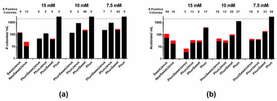 To confirm these new cassettes function in the pneumococcus, we transformed TIGR4/TIGR4S and D39/D39S with each of these cassettes, which replace the capsule loci through homologous recombination with dexB and aliA. We isolated colonies that were unencapsulated and had no resistance to the counter-selection agents (Table 5). We then transformed each of the new strains with D39 genomic DNA and screened with the appropriate counter-selection agents. For all strains that contained the mutated pheS, we selected transformants on three different concentrations (7.5, 10, and 15 mM) of chlorinated phenylalanine to identify the concentration with the highest stringency [20,23]. We were able to obtain positive recombination of capsule for all strains except for TIGR4Δcps::Phun (Figure 5). Here, 7.5–10 mM chlorinated phenylalanine for TIGR4 and 15 mM chlorinated phenylalanine for D39 yielded the best true-positive to false-positive ratios overall (Table 6). While using chlorinated phenylalanine alone (Phun) as a counter-selection agent is feasible, without a second agent, the frequency of false-positive is much higher than that with two or more counter-selection agents (Figure 5), similar to sacB or rpsL alone [11].