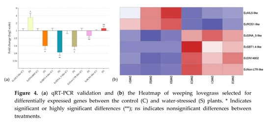 (a) qRT-PCR validation and (b) the Heatmap of weeping lovegrass selected for differentially expressed genes between the control (C) and water-stressed (S) plants. * Indicates significant or highly significant differences (**); ns indicates nonsignificant differences between treatments.