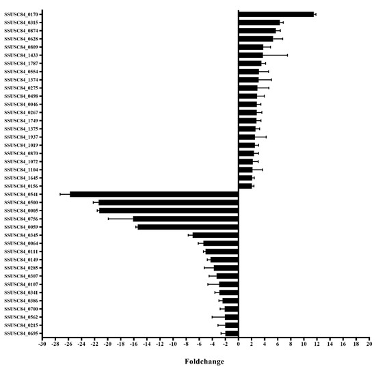 In vivo induction assay for the analysis of transcriptional regulators in the genome of Streptococcus suis SC84 that are differentially expressed (fold-change ≥ 2 or ≤ −2). Ten specific pathogen-free C57BL/6 mice were intraperitoneally infected with 5 × 108 CFUs of the WT strain. Mice were sacrificed and dissected after 6 h. The spleens were harvested, and the bacteria were isolated. As a control, 5 mL of in vitro WT strains were collected when the OD was 0.6, representing mid-stationary phase. Furthermore, the bacterial RNA was extracted, and qRT-PCR was performed.