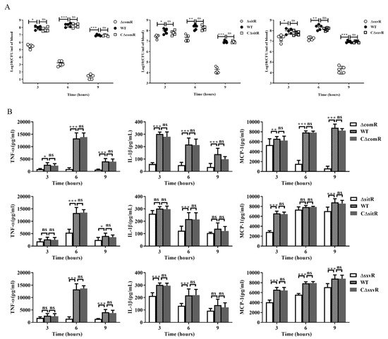 Bacterial loads and cytokine concentrations in the blood of mice after SS2 infection. Female C57BL/6 mice were challenged with 2 × 108 CFU of WT, ΔcomR, CΔcomR, ΔsitR, CΔsitR, ΔsxvR or CΔsxvR strains cultured on tryptic soy agar. After infection for 3, 6, or 9 h, an equal number of mice in each group were sacrificed to collect blood. (A) Bacteria loads in the blood were examined by determining CFU counts. The results shown are representative of three independent experiments. (B) Blood cytokine concentrations were determined by enzyme-linked immunosorbent assay. * p < 0.05, ** p < 0.01, *** p < 0.001, ns means no significance.