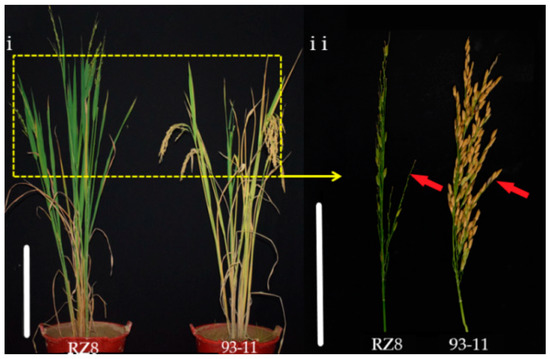 Phenotypic variation of grain shattering in RZ8 and 93-11; Whole plant phenotype showing grain shattering (bar = 50 cm), grain shattering (bar = 10 cm, red arrows).
