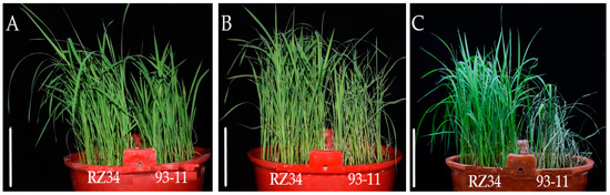 Cold stress treatment to RZ34 and 93-11 at seedling stage. (A) Before cold stress (bar = 10 cm); (B) after cold stress (bar = 10 cm) and (C) after three days of recovery (bar = 10 cm).
