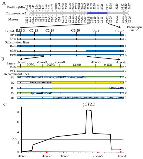 Mapping of grain-shattering QTL qCT2.1, (A) QTL analysis by overlapping segments of recombinants RZ34, RZ35 and RZ29, blue intervals indicate DP30 genotype; blank intervals indicate: 93-11 genotype; shadow intervals indicate heterozygous genotype; (B) linkage analysis of qCT2.1 yellow intervals indicate RZ34 genotype, blank intervals indicate 93-11 genotype, shadow intervals indicate heterozygous genotype; (C) LOD value of qCT2.1. dxw-3, dxw-8, dxw-9, dxw-5 and dxw-4 are InDel markers.