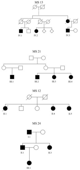 Multiple sclerosis (MS) is a chronic disease of the central nervous system (CNS), characterized by inflammation, demyelination, neurodegeneration, and astrogliosis. There is evidence for a genetic contribution to MS risk in epidemiological studies [1]. Cases of familial aggregation were described as early as the beginning of the 19th century [2]. Since then, family studies have convincingly shown that the risk for MS in monozygotic twins is up to 30% and up to 3% for individuals with a first-degree relative suffering from MS compared to the general population (0.1–0.3%) [3]. Within the last 15 years, great international efforts have identified over 200 genome-wide association (GWA) variants with little effect on individual risk [4,5]. Still, the molecular haplotype HLA-DRB1*15:01, described in the early 1970s, had the strongest and most consistent association with disease susceptibility [6]. Rare variants, exhibiting low frequencies in the general population (minor allele frequency < 0.5%), but exerting a stronger effect on disease susceptibility, were not detected by GWA studies due to their low frequency, which might explain the missing heritability [7]. Remarkably, a recent rare variant association study that included 32,000 MS cases suggested that up to 5% of MS heritability is explained by low-frequency variations in gene coding sequences [8]. However, the effect sizes of these variants were small (OR of ~2) and, intriguingly, they were found to be rather protective of disease. In total, rare and common variants together explain only about 50% of the estimated heritability [5,8]. Familial contribution to MS etiology has long been recognized, and many cases of families with apparent monogenic inheritance have been reported [2,9]. In the last decade, a number of putative familial high-risk genes were suggested by whole-exome sequencing (WES) studies of multi-case MS families [10,11,12]. However, none of these genes were confirmed in independent studies [10,11,12,13,14,15]. To elucidate potential putative high-risk genes, we performed WES in four MS families with three or more affected individuals and filtered for rare variants segregating with disease in the respective family. In this study, we aimed to share variants potentially implicated in MS pathogenesis and to serve as a resource for other research groups who wish to further investigate the genetic background of familial MS.